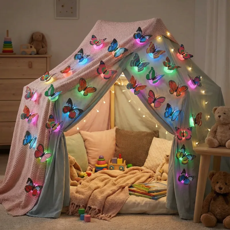 Decisamente un modo divertente per decorare. I miei gemelli amano fingere di vivere in una foresta piena di farfalle luminose ogni notte.