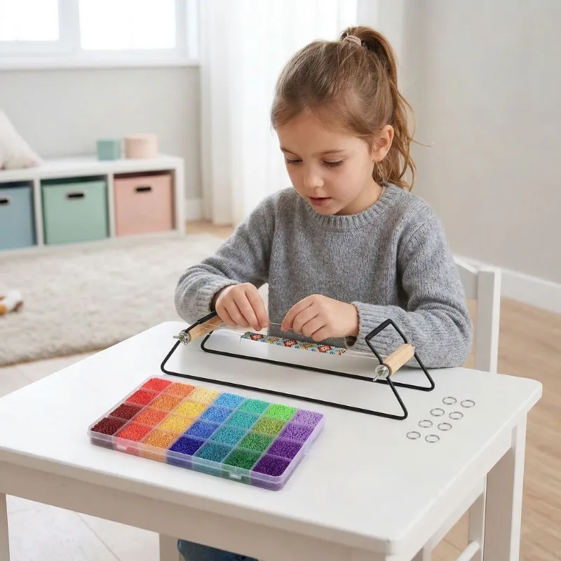 Usiamo questo kit durante il tempo in famiglia. Mentre chiacchieriamo, il nostro bambino intreccia tranquillamente braccialetti, sviluppando concentrazione e motricità fine quasi senza accorgersene.