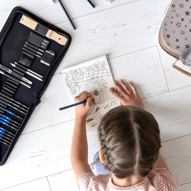 Provare nuovi trucchetti di disegno è più facile con così tanti materiali. Mi piace poter prendere l’astuccio e disegnare ovunque.