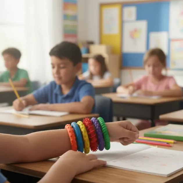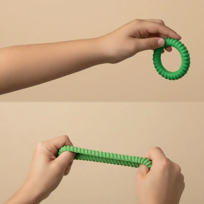 All’ultimo intervallo, la mia amica mi ha fatto provare il suo braccialetto elastico. Era morbido e soffice, perfetto per calmarsi.