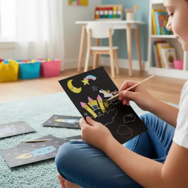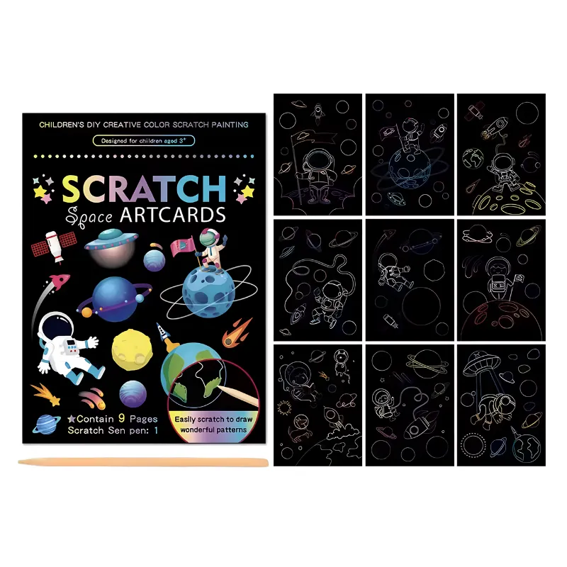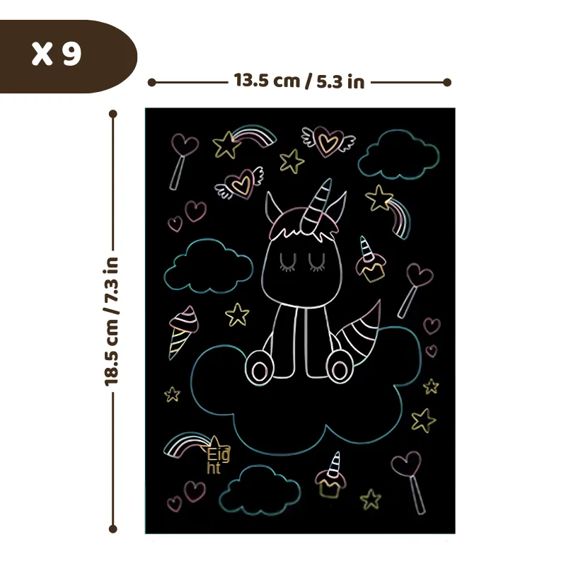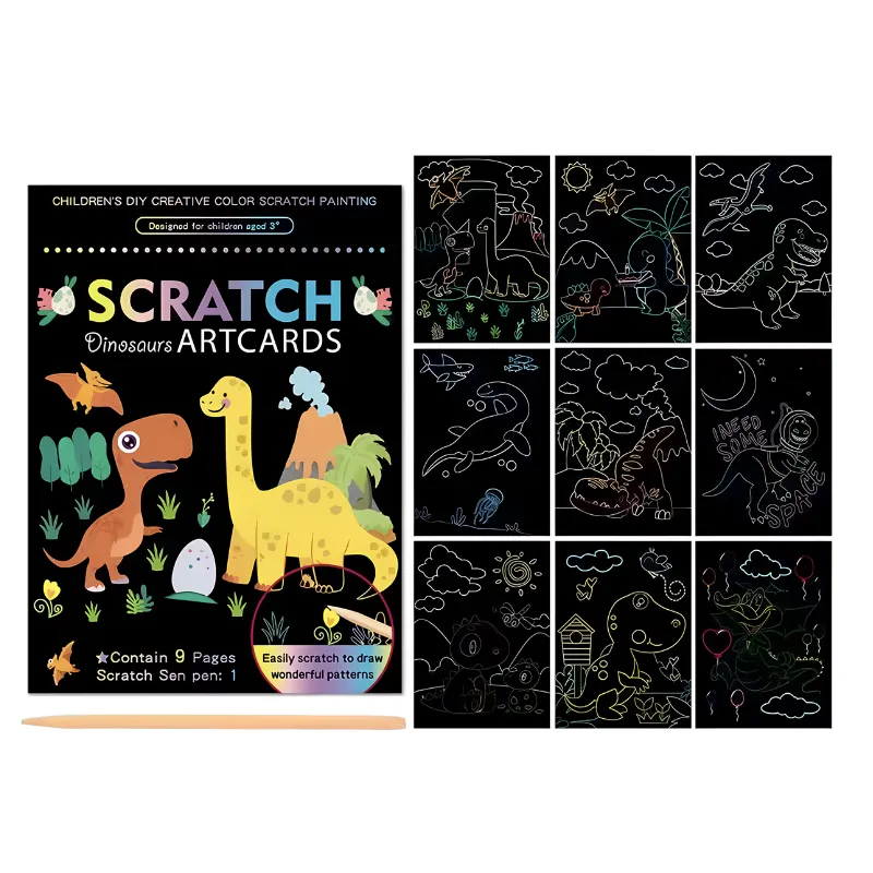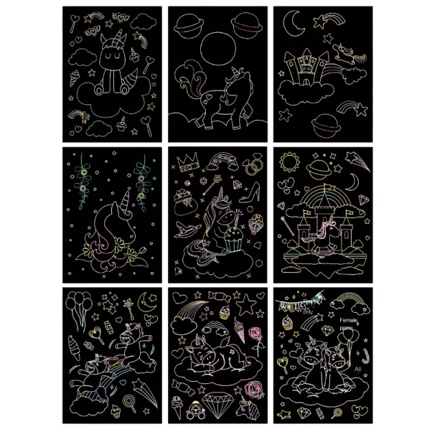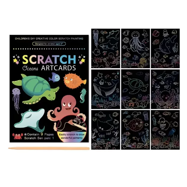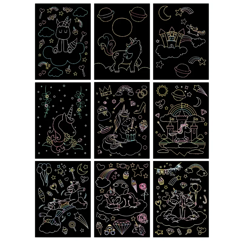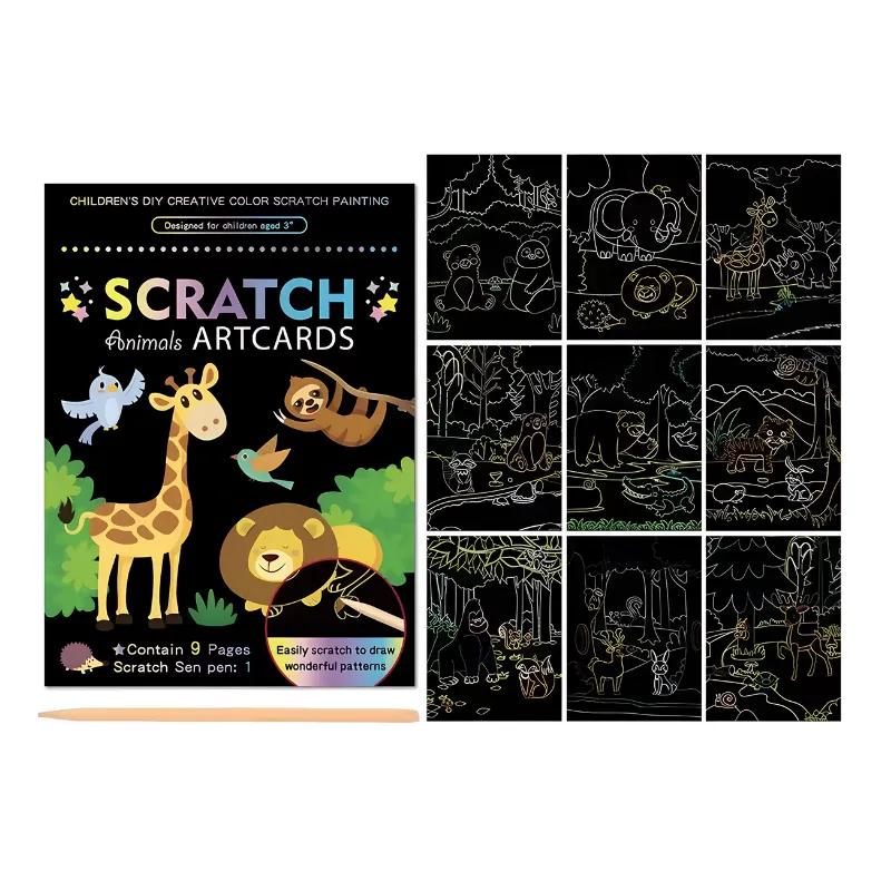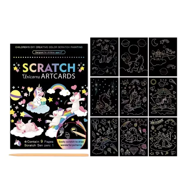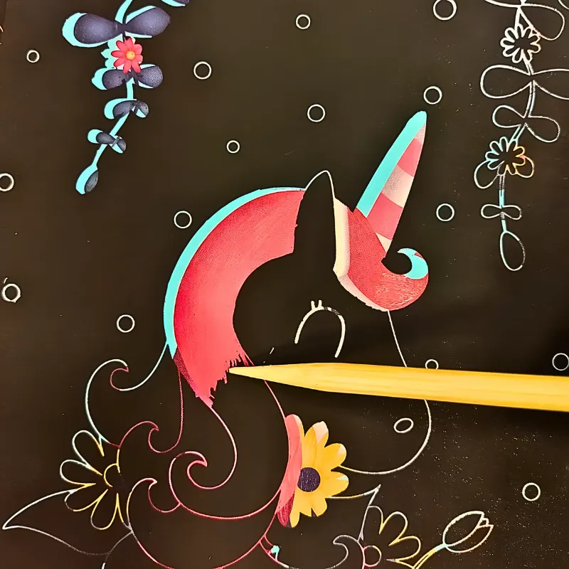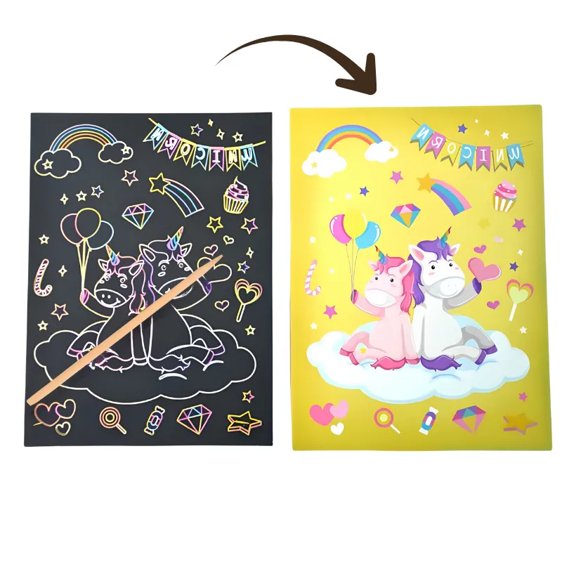 Guarda la creatività fiorire mentre ogni foglio rivela colori brillanti. I disegni magici appaiono a ogni graffio, mantenendo i bambini coinvolti. Splendidi effetti luminosi trasformano ogni opera in un capolavoro unico.