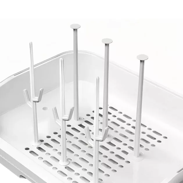 Sta perfettamente vicino al lavandino e fa risparmiare tanto spazio sul piano. Inoltre, i biberon sono sempre pronti per le poppate notturne.