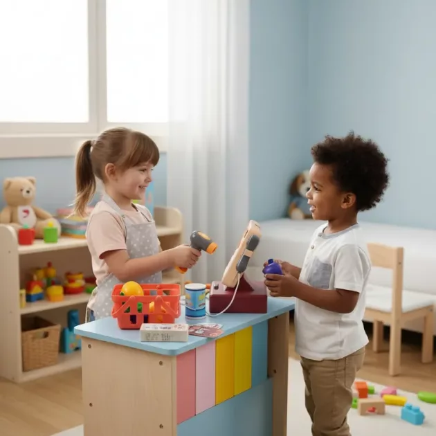 Usiamo questo giocattolo con frutta e verdura finta. I miei figli ora si alternano tra cassiere e cliente, imparando a collaborare senza neanche accorgersene.