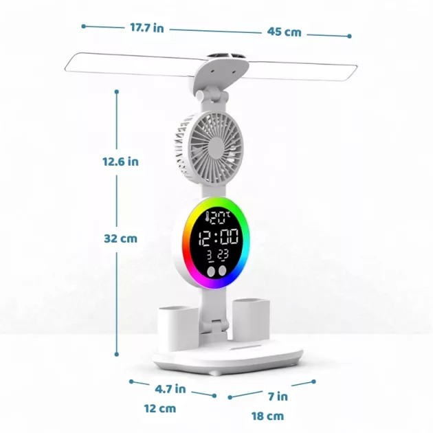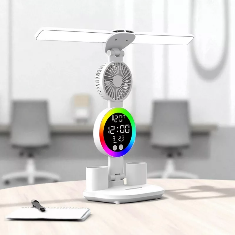 Uso la lampada e la ventola ogni mattina. L’orologio è facile da vedere e la mia scrivania ora rimane ordinata.