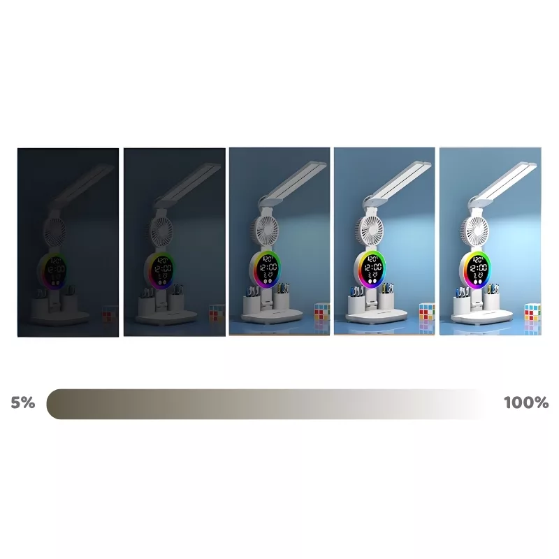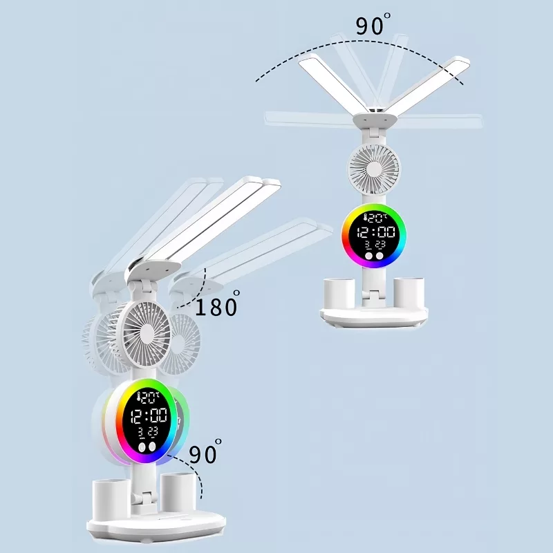 Uso la lampada ogni sera per i compiti. La ventola mi mantiene fresca e l’orologio mi aiuta a tenere traccia del tempo. Super utile!