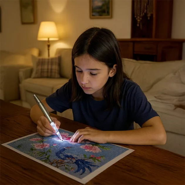 La punta luminosa aiuta a mantenere i diamanti al posto giusto. I lavoretti restano puliti e senza disordine, ed è davvero rilassante. La uso quasi ogni giorno.
