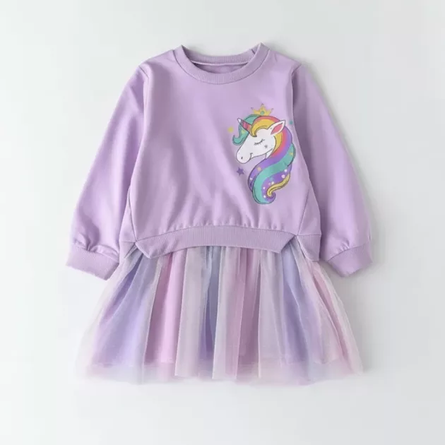 Vestito Bimba Unicorno Cotone Manica Lunga Effetto Doppio Pezzo