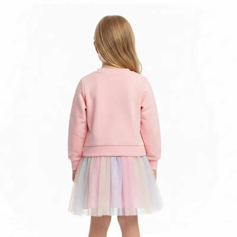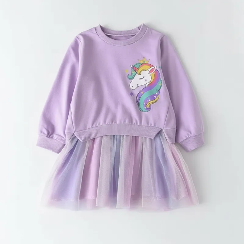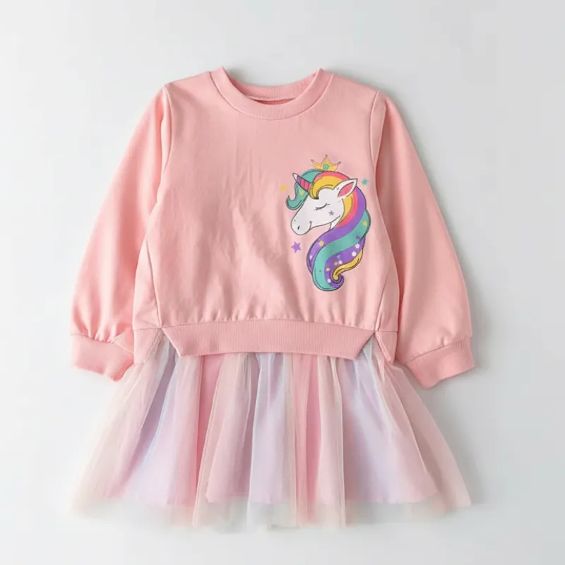 Vestito Bimba Unicorno Cotone Manica Lunga Effetto Doppio Pezzo