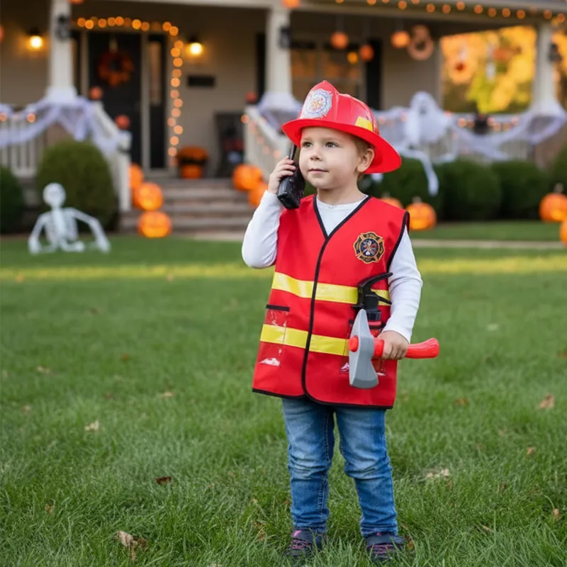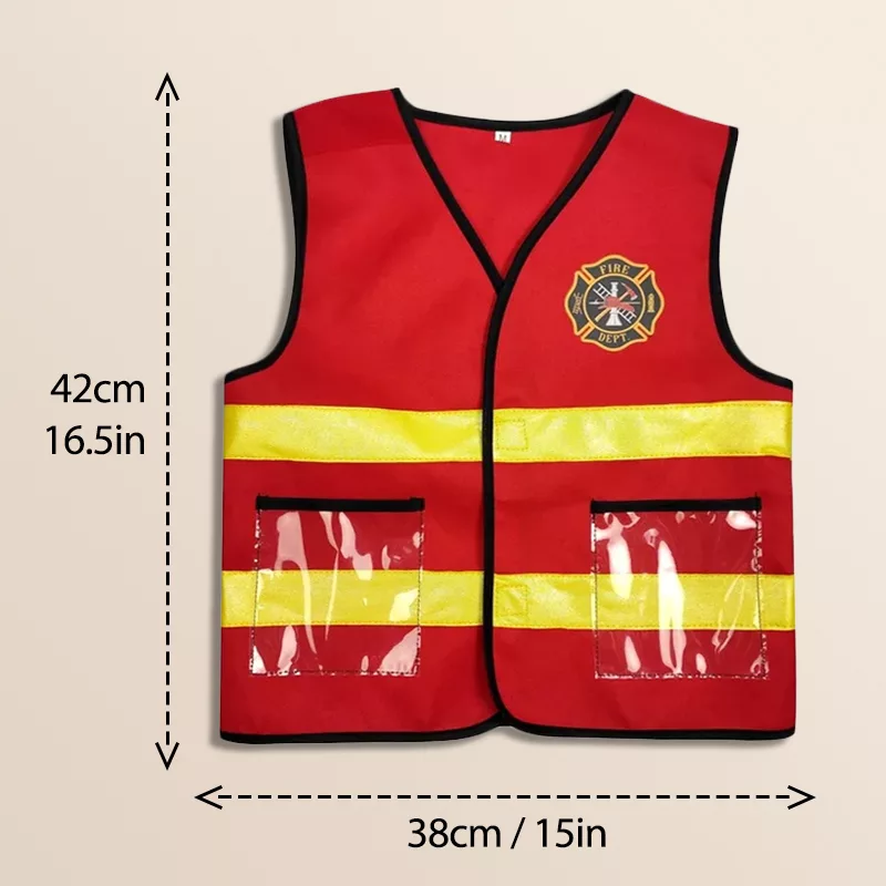 Mio figlio adora giocare all’eroe ora grazie a questo fantastico kit da pompiere. Il cappello calza bene e il gilet è facilissimo da indossare.