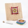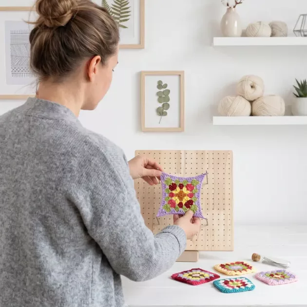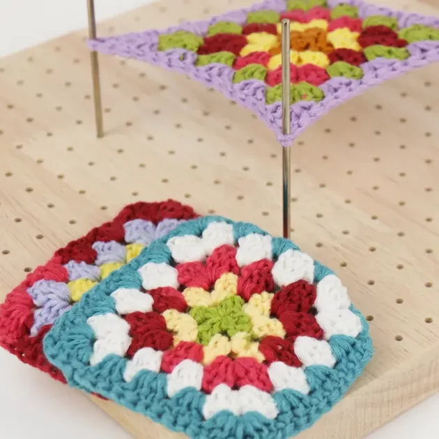 Ho preso questa tavoletta per l’uncinetto per i pomeriggi di pioggia, e ora mia figlia chiede il momento della lana invece della TV. I suoi piccoli quadrati vengono così ordinati.