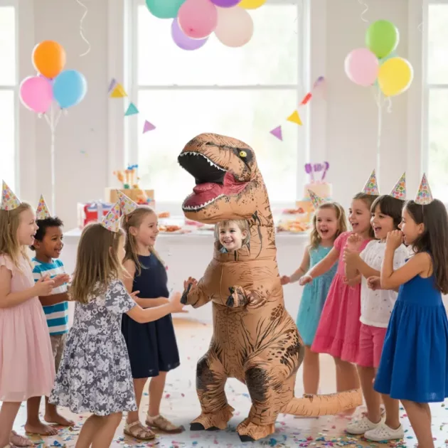Mio figlio ha indossato il costume da T-Rex tutto il giorno alla sua festa di compleanno, correndo e ridendo con i suoi amici. Ha reso la giornata ancora più speciale!