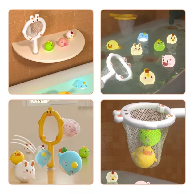 Rendi speciale il bagnetto del tuo bambino con i giocattoli luminosi Kidzly. Cattureranno la curiosità dei più piccoli, rendendo questa routine più divertente per tutti. Il set include una rete per una sfida in più.