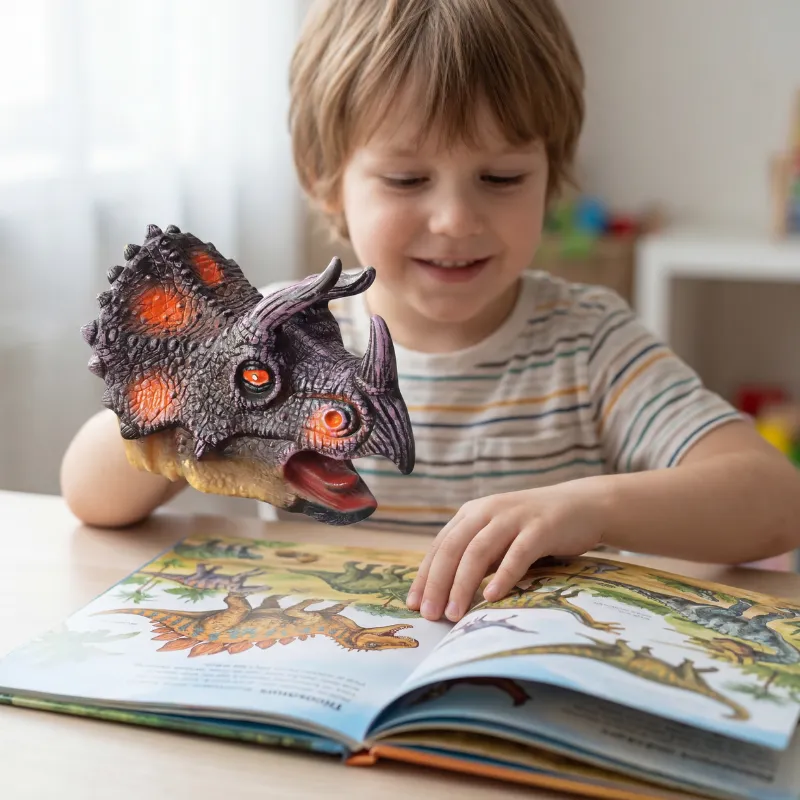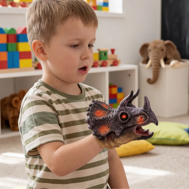 Abbiamo trasformato il salotto in un “museo dei dinosauri”. Il mio bambino fa domande sulle diverse specie mentre il burattino “guida” la visita. Imparare sembra un gioco.