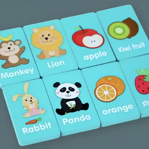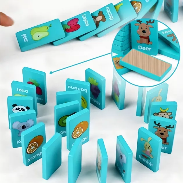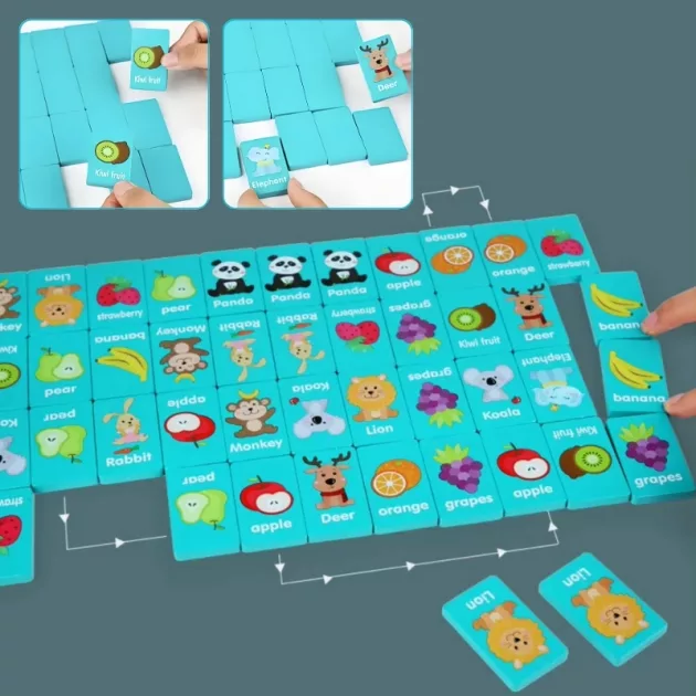 Design vivace - Ogni tessera domino presenta illustrazioni vivaci di animali o frutti. Questi disegni divertenti cattureranno l’attenzione dei bambini e stimoleranno la loro creatività.